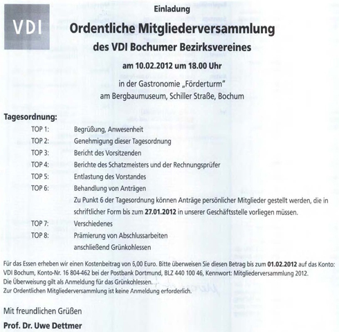 Der langjährige Kassenprüfer Dipl.-Ing. Franz Böttcher wird in Abwesenheit mit der Ehrenmedaille des VDI für seine langjährige erfolgreiche Tätigkeit im Bochumer Bezirksverein geehrt